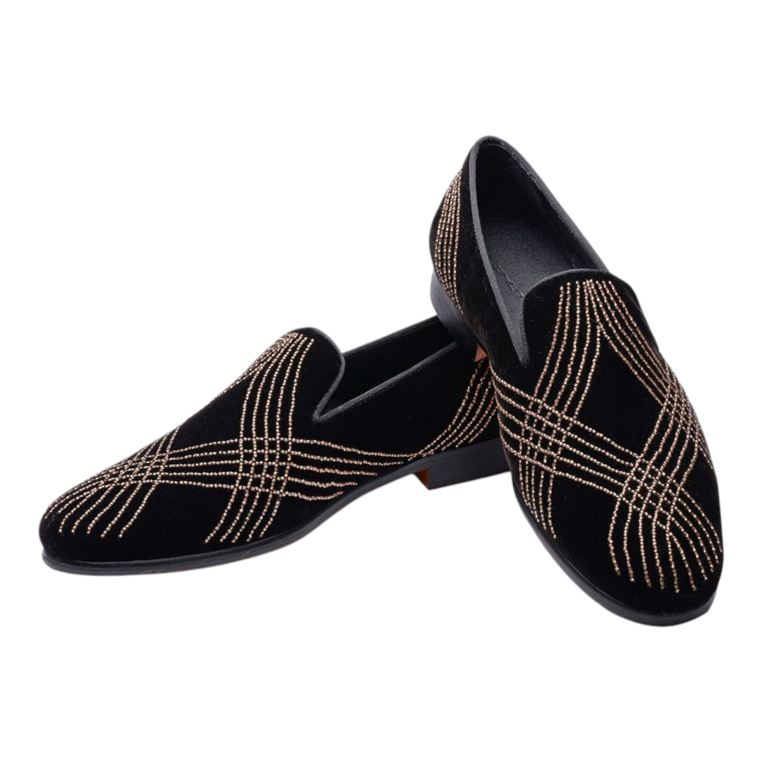 Step into timeless sophistication with the Noir Éclat Loafers by Lusso FINO, designed for the modern groom and the man of refined taste. Crafted from rich black velvet, these loafers feature intricate golden thread embroidery in a striking geometric pattern—an artistic fusion of elegance and boldness.